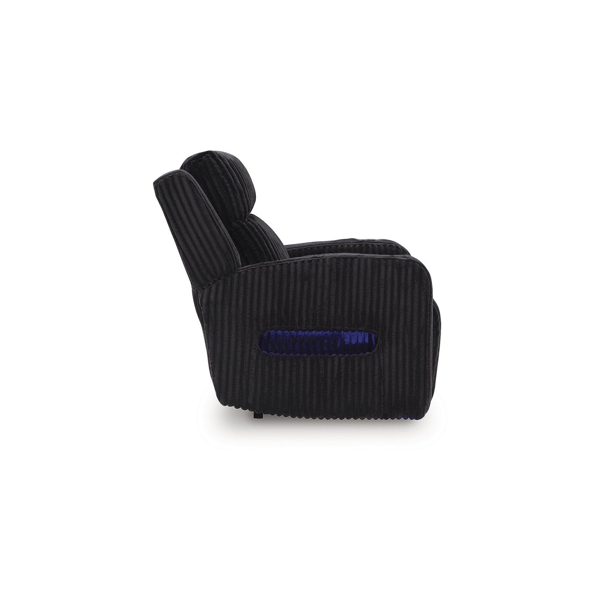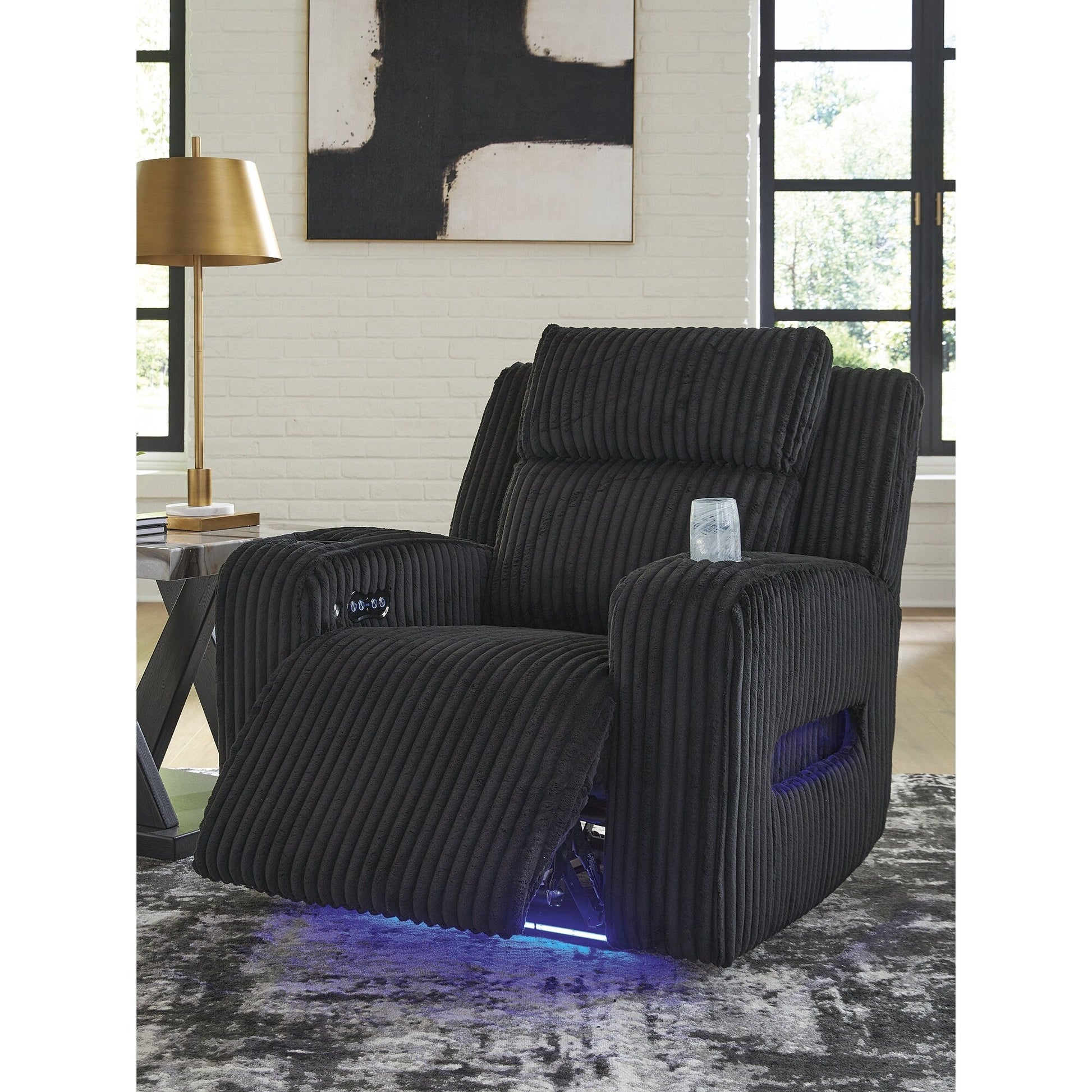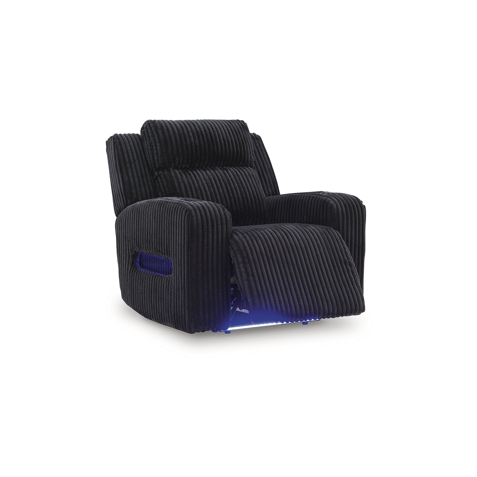 Trend-right style, meet irresistible modern function. Your living room gets a cozy-cool upgrade with this power recliner. Curl up in its ultra-chic corded upholstery and recline with one-touch controls. Is it movie night or game time? With ambient LED lighting, this recliner transforms from a serene relaxation spot to an entertainment hub. USB charging, cup holders and storage cutouts make lounging all the more convenient.