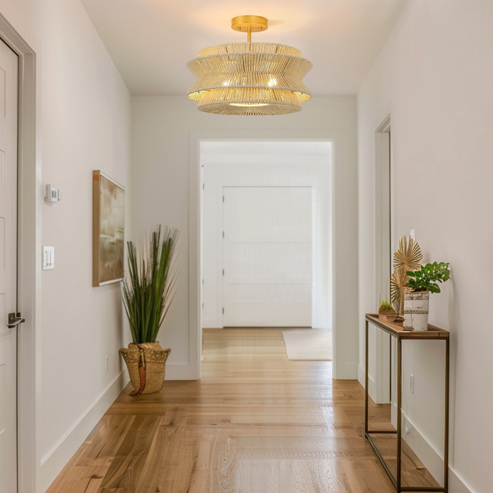 Coastal-inspired semi flush mount ceiling light, crafted of hand-woven rattan rope drum shade and antique gold/matte black hardware, is the unique blend of eclectic nautical and mid century contemporary style. Filtering the light from within, each piece creates a play of light and shadow in a room, adding an inviting ambience. This collection can work with a variety of boho decors and even work in homes with coastal or farmhouse styling, which is an ideal selection for hallway, entryway, stairway, door way, or a foyer to bring warmth to a living room or bedroom