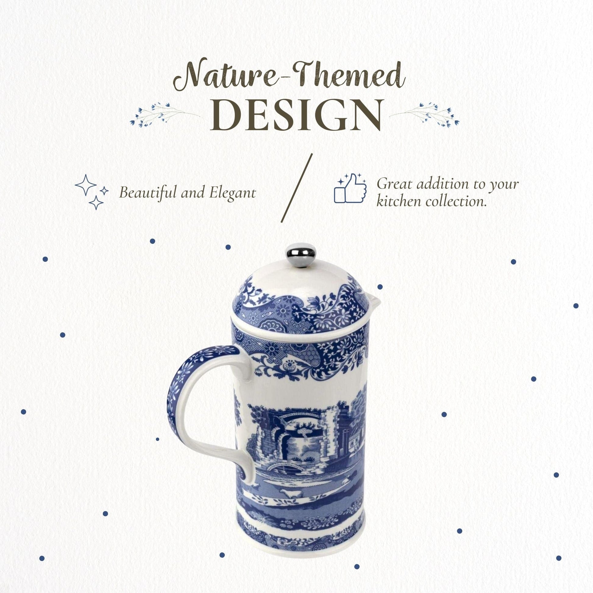 - Crafted with Detail: Featuring an 18th-century Imari-style border and a scenic countryside design, this porcelain French press adds charm and function to your coffee cart essentials.