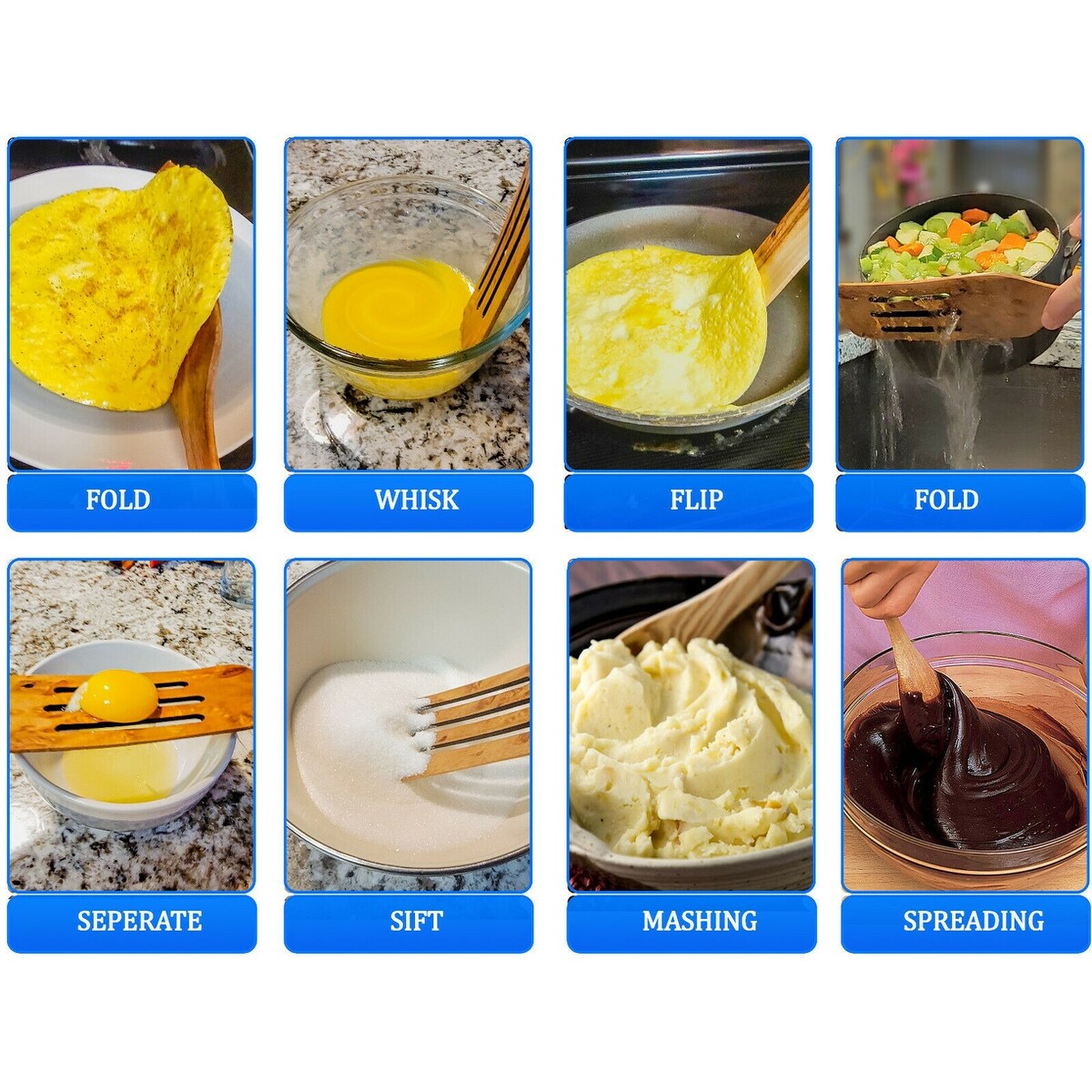Use for making easy Fold and flip fried eggs, flapjacks, and omelets, or smash potatoes, veggies, you name it. Easily separate yolks and whites, Sift and mix dry and wet ingredients, and scrape food out of pans, pots, and bowls. Easy to clean as well! Just hand wash it and hang to dry. Don't put it in water for very long time. Oil these wooden products can help to keep them from getting too dry, which can eventually cause cracking. Not All Spurtles Are Created Equal Some are made of flimsier woods that easily chip and brea, while others are made of silicone, which can melt in contact with heat. No only that, but if you like to use nonstick pots or pans, you are at risk of scratching the Teflon, especially if using metal utensils. You no longer have to worry about that with out All In One Cooking Teak Wood Utensils! The secret's the finer-grade teakwood, sanded for splinter-free smoothness, so you can stir, scrape, and whisk without scratching.