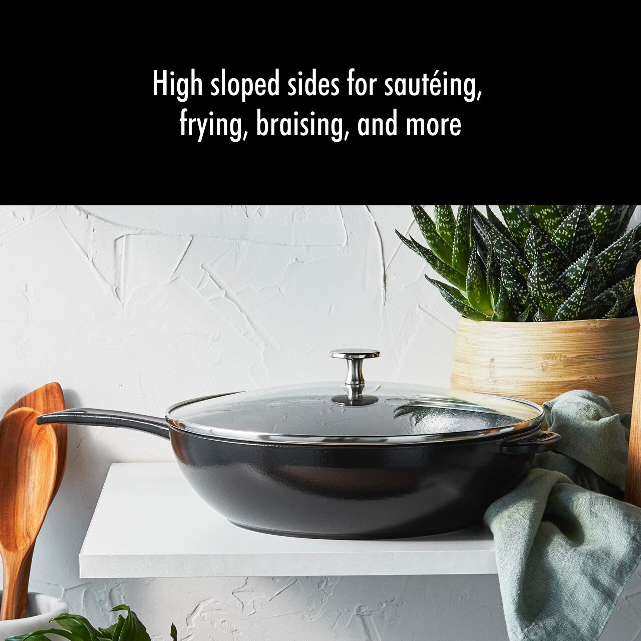 - 2.9-quart cast iron pan with high sloped sides that’s ideal for sautéing, frying, braising, and more
