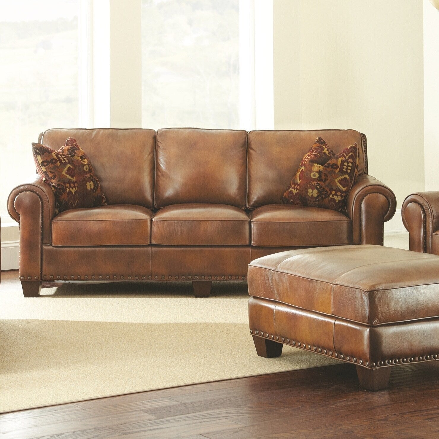 Enjoy the cozy southwest style of the Sanremo top grain leather sofa. Top grain leather in rustic caramel brown is accented by oversized antique brass nail head trim. Rolled arms and plush seating features, an eight-way hand tied spring system with pocketed coils, 2.0 HR foam, and feather, fiber and down filling for long lasting comfort. The seat and back cushions are removable for easy cleaning. Two stylish down filled accent pillows add the perfect finishing touch to this casual, rustic style sofa. Your purchase includes one (1) sofa.