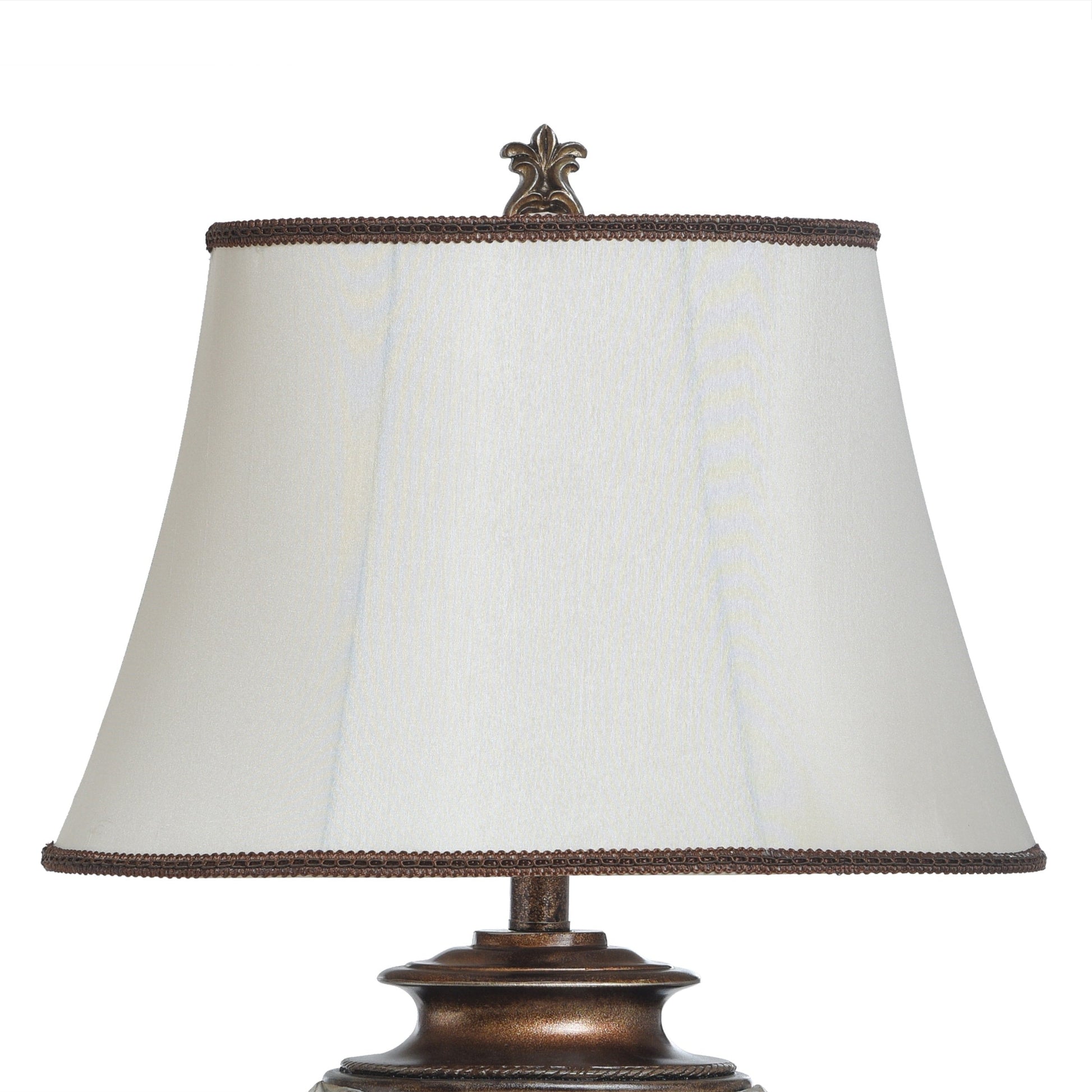 This ornate lamp showcases a highly embellished frame with a Cream, Off White and Antique Gold finish and a matching finial. An Off-White tapered oval softback shade with brown trimmed shade completes the gorgeous base. An elegant accent for a living room, office, or hallway, this lamp also works well on a dining room buffet or a bedroom nightstand.
