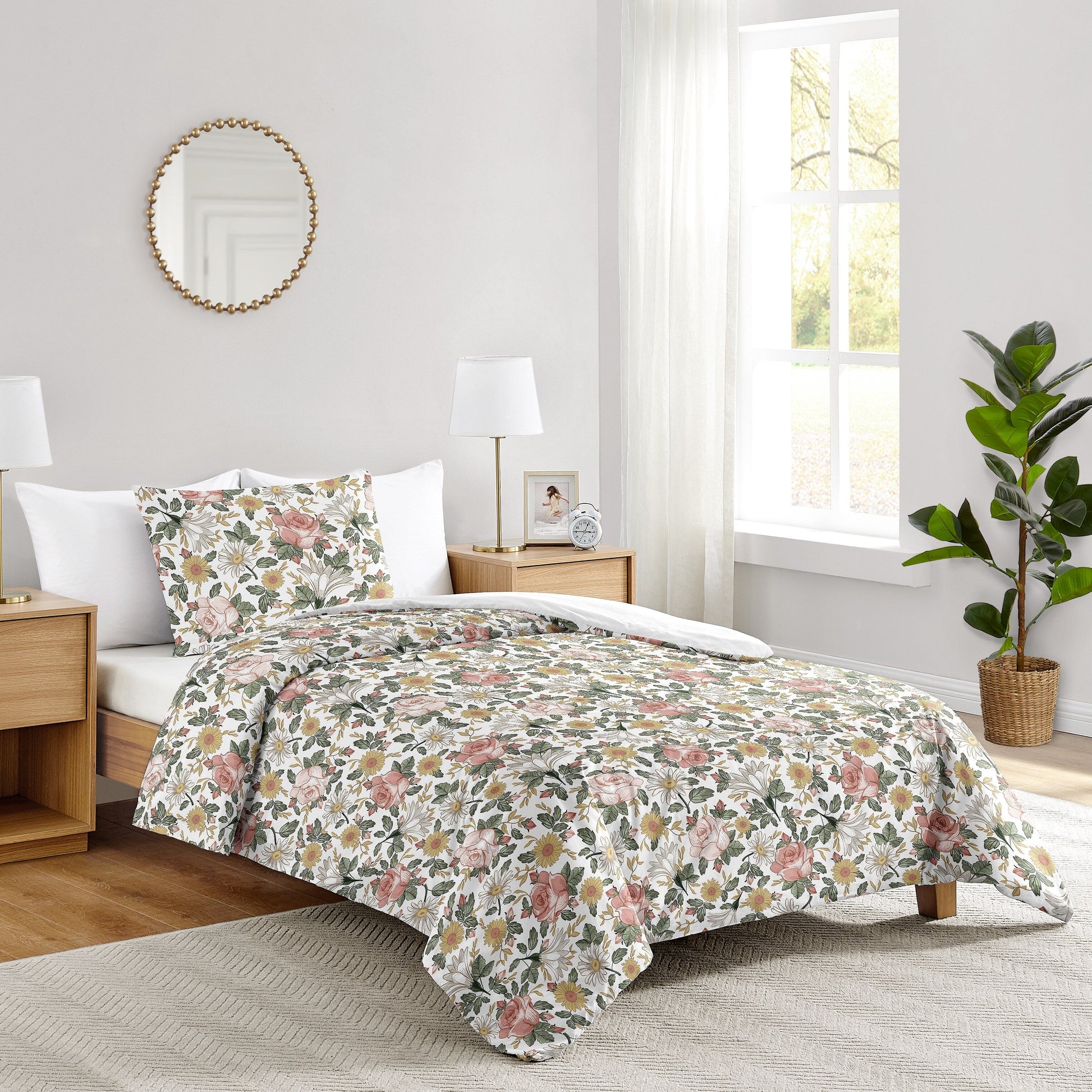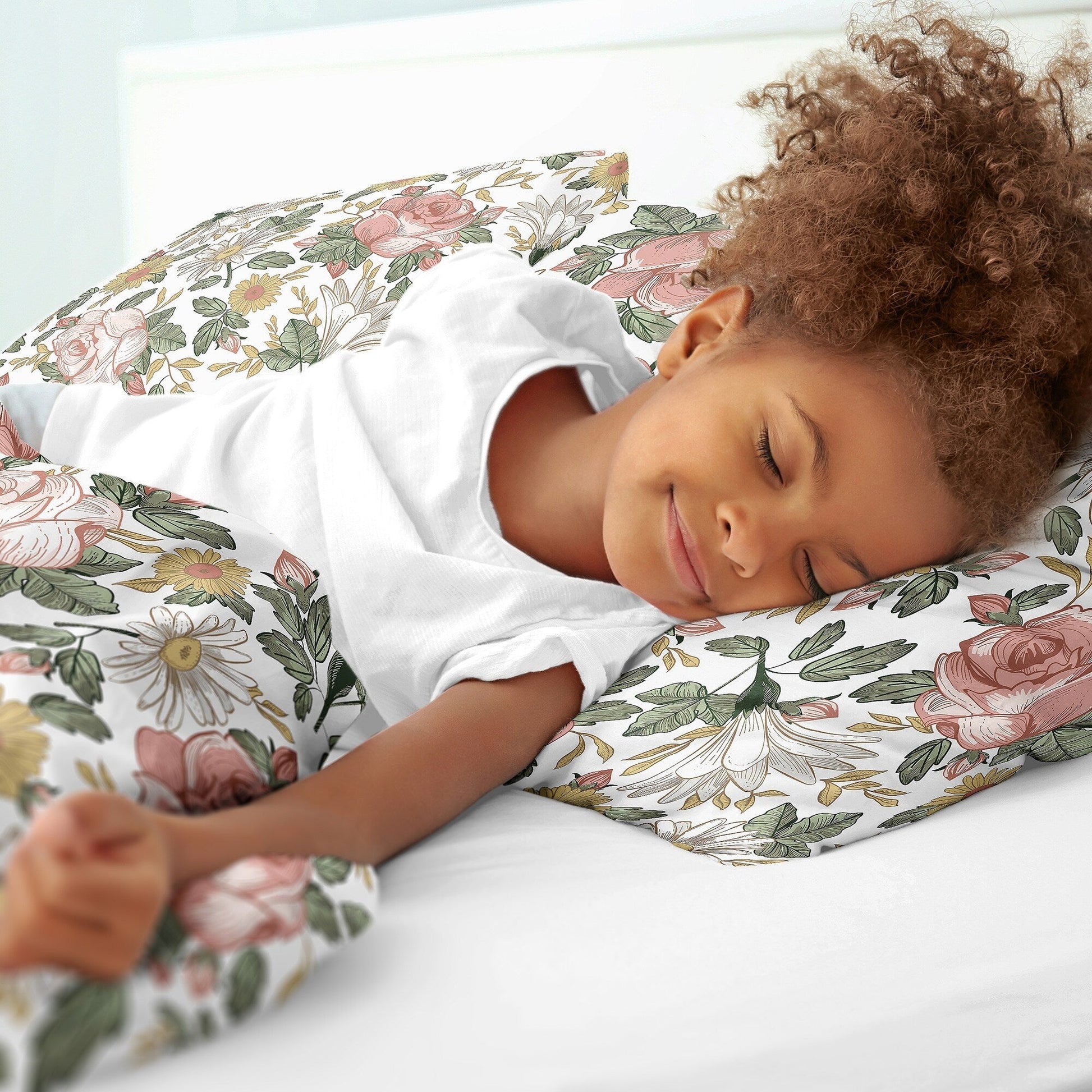 Transform your or your child's bedroom into a cozy and stylish retreat with our 2pc Pink and Green Vintage Floral kids bedding sets for girls by Sweet Jojo Designs. Designed for people who love both style and comfort, this twin size bedding set features vibrant colors and fun patterns. This twin bedding comforter sets for girls uses a sensational collection of exclusive, brushed microfiber fabrics. This all-in-one twin bed in a bag set includes a super-soft twin blanket and a matching pillow sham, offering the perfect blend of warmth, comfort and durability. The soft comforter features a vintage inspired wildflower floral print. The rich color palette of pinks, greens, yellows and white will set your bedroom up in high style. There is no age limit to style! Perfect for all ages - whether you're looking for a twin bedspreads for adults or a fun, themed kids twin bedding set, this versatile collection has you covered with the perfect childrens and toddler twin bedding set. Our twin bedding sets for adults provide softness & quality, making it perfect for those who appreciate luxury bedding without the hefty price tag. Whether you're updating your guest bedroom essentials, need dorm bedding, or upgrading your child's room, this twin bedding set is a must-have. This girls bedding sets twin by Sweet Jojo Designs will fit all standard twin size beds. 2PC TWIN BEDDING SETS FOR GIRLS INCLUDES: Lightweight Comforter (62in. x 86in.) & Standard Sham (20in. x 26in.). Easy machine washable and dryable on low. This vintage garden twin comforter set for girls is made with super soft, moisture wicking brushed microfiber fabric and features the rich bohemian farmhouse color palette of blush pinks, sage greens, yellows and white. BOHO FLORAL THEME: This twin girls bedding set boasts a soft blanket & pillow case sham. The bed comforter features a classic, wildflower, leaves, daisy, rose, flower, leaf print. This twin bed set has a matching pillow sham with the same print.