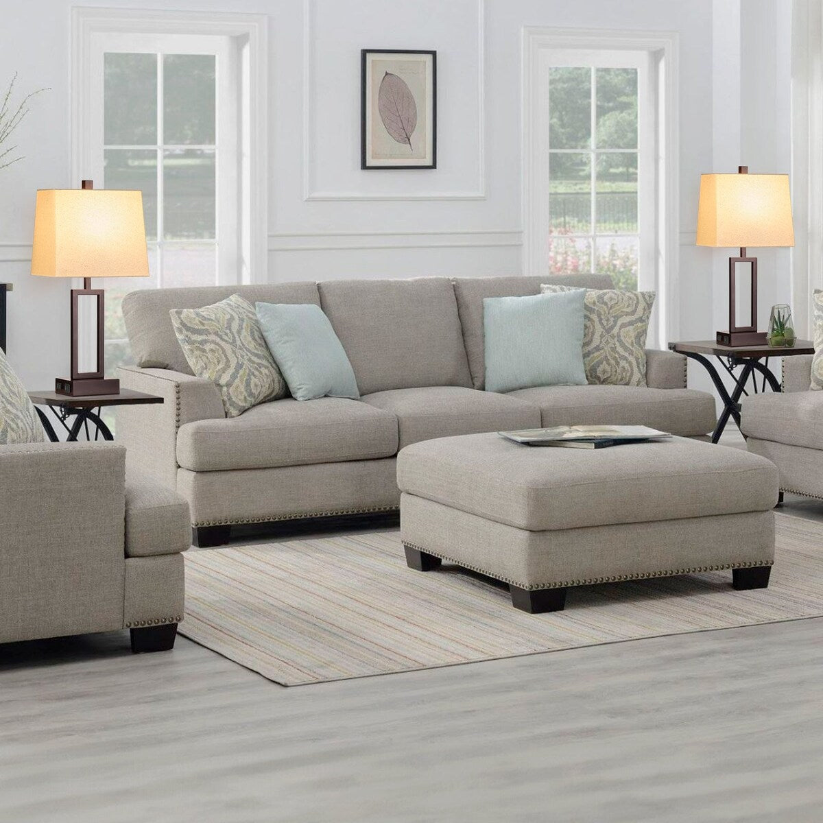 Matte metal table lamps with door-frame style appearance.The lamp is controlled by the touch switch. The touch switch is a 3-Way dimming switch on the lamp base. Just touch any point of the lamp base to change and get the more comfortable brightness.The shade is made of linen and is assembly free design.It's easy to clean and maintain. The LED bulbs(2700K, 800 Lumens) are included. They are compatible for E26 lamp holder. You can replace it with various bulbs(within 60W) what you like during use. The lamp body is made of metal and its surface is painted with a layer of brown matte coating. When you turn it OFF, the lamp body is brown. It will show you richer colored visual experience when you turn it ON. The lamp base comes with more extended features, such as the dual charging ports(USB + type-C) and an AC outlet. Although you turn it OFF, the charging ports and AC outlet are still keep active separately. They can power your smart devices conveniently at your hand even your forget your adapter. Additionally, the lamp base has a non-slip mat. It's silent when you move it. It's easy to merge with your home decorations.