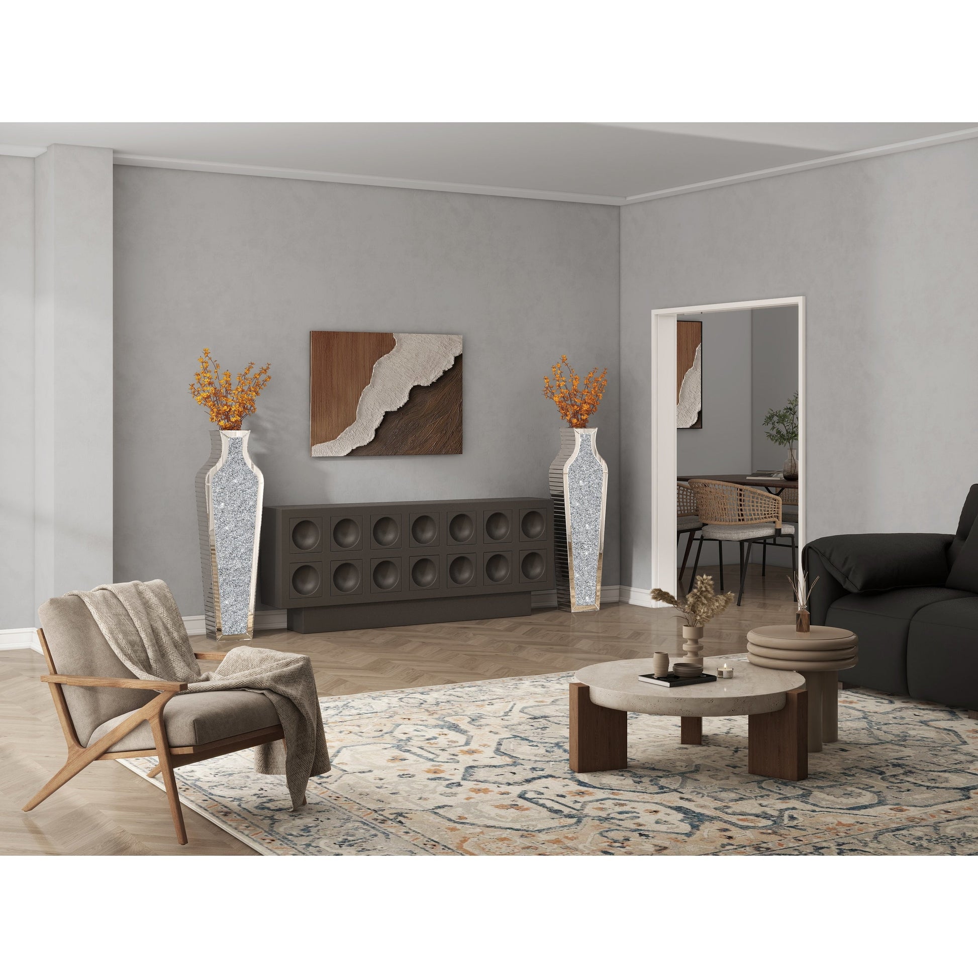 If you like to decorate your home, this floor vase will be your best choice, it can be well placed in any corner, especially at the entrance, next to the TV cabinet, in the middle of the sofa. Appreciate their design best against solid-colored backgrounds in elegant settings. They make great unique decor on mantle, console table or in any living space. Designed with mirror top and crushed diamond vase body. This floor vase decorative botanical and flowers to bring some bright and texture in your living space. Suitable for indoor use. Glam style. Vase has a 4.6 in mouth opening,26.8'/36'/43' silver mirror vase.