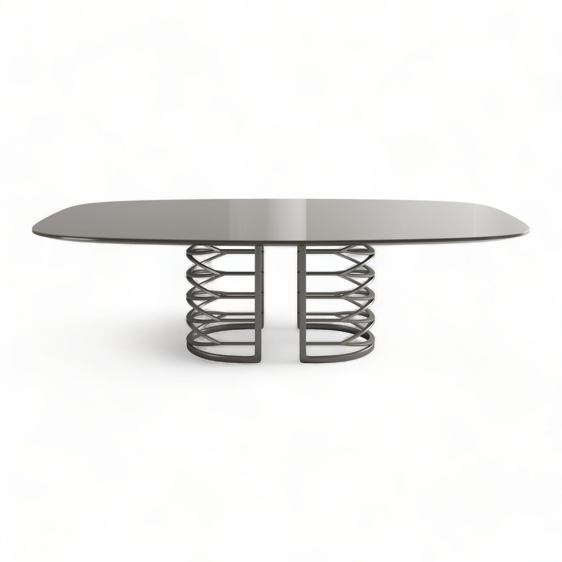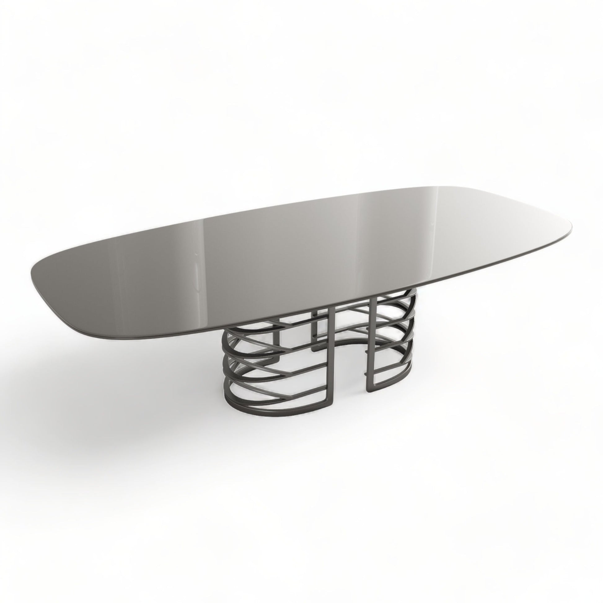 [Description] La table à manger Taro en graphite est un meuble emblématique du design moderne. Cette table rectangulaire est idéale pour les grandes salles à manger, où elle se distingue par son design unique. Elle est dotée d'un plateau en verre couleur graphite sur un plateau laqué métallisé mat graphite aux bords chanfreinés, soutenu par un piètement métallique incurvé unique, thermolaqué. Un design élégant et une finition soignée sont parfaits pour la salle à manger.
