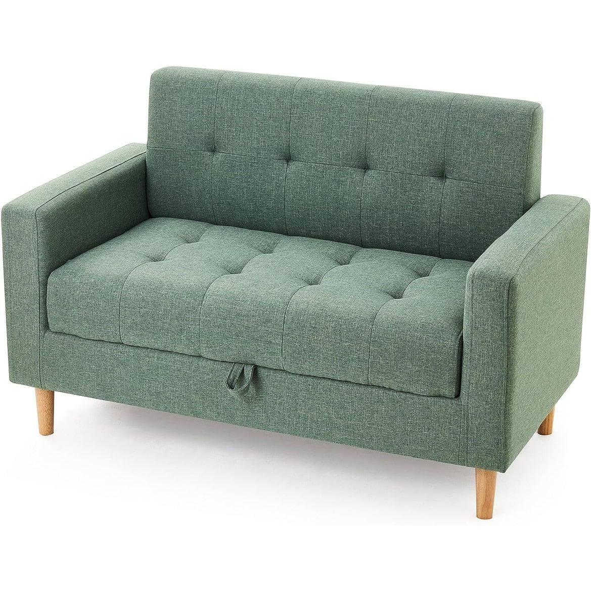 - Compact sized sofa with comfy foam cushion and hidden storage for versatile furniture