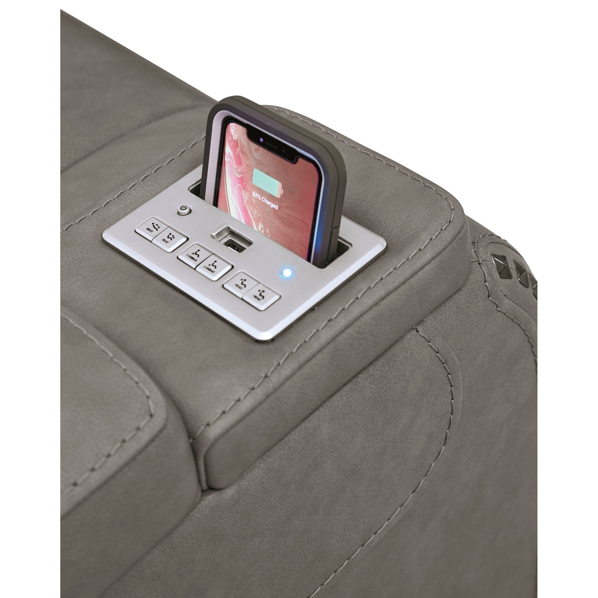 Reserved for him and made for her, This power recliner in gray delivers all the comfort and style you could ask for. Inspired by sports car interiors, the seating area is covered in real leather for your pleasure, with a 'perforated automotive' treatment for that much more appeal. Positioned at your fingertips, the advanced one-touch power control puts you in the driver's seat with everything from an Easy View? power headrest and power lumbar support, to a USB port and wireless charging for your phone. And with an integrated cup holder and hidden storage compartments under the posh, padded armrests, this designer power recliner makes the most of every inch of space.