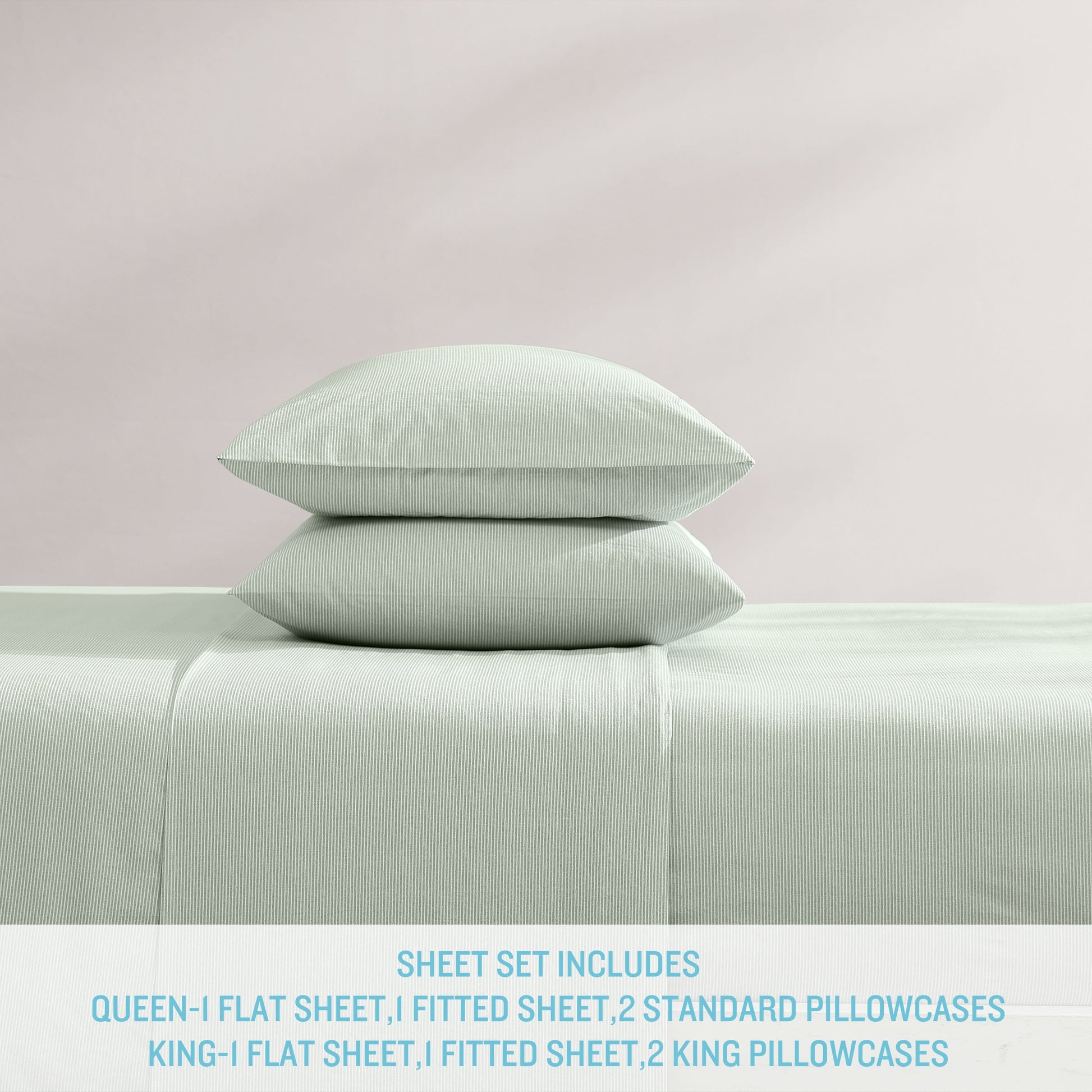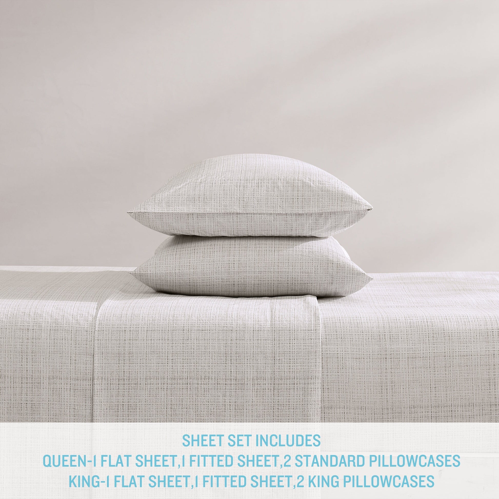 King sheet set includes: One flat sheet (102'L x 108'W), one fitted sheet (80'L x 78'W) and two king pillowcases (20'L x 40'W)