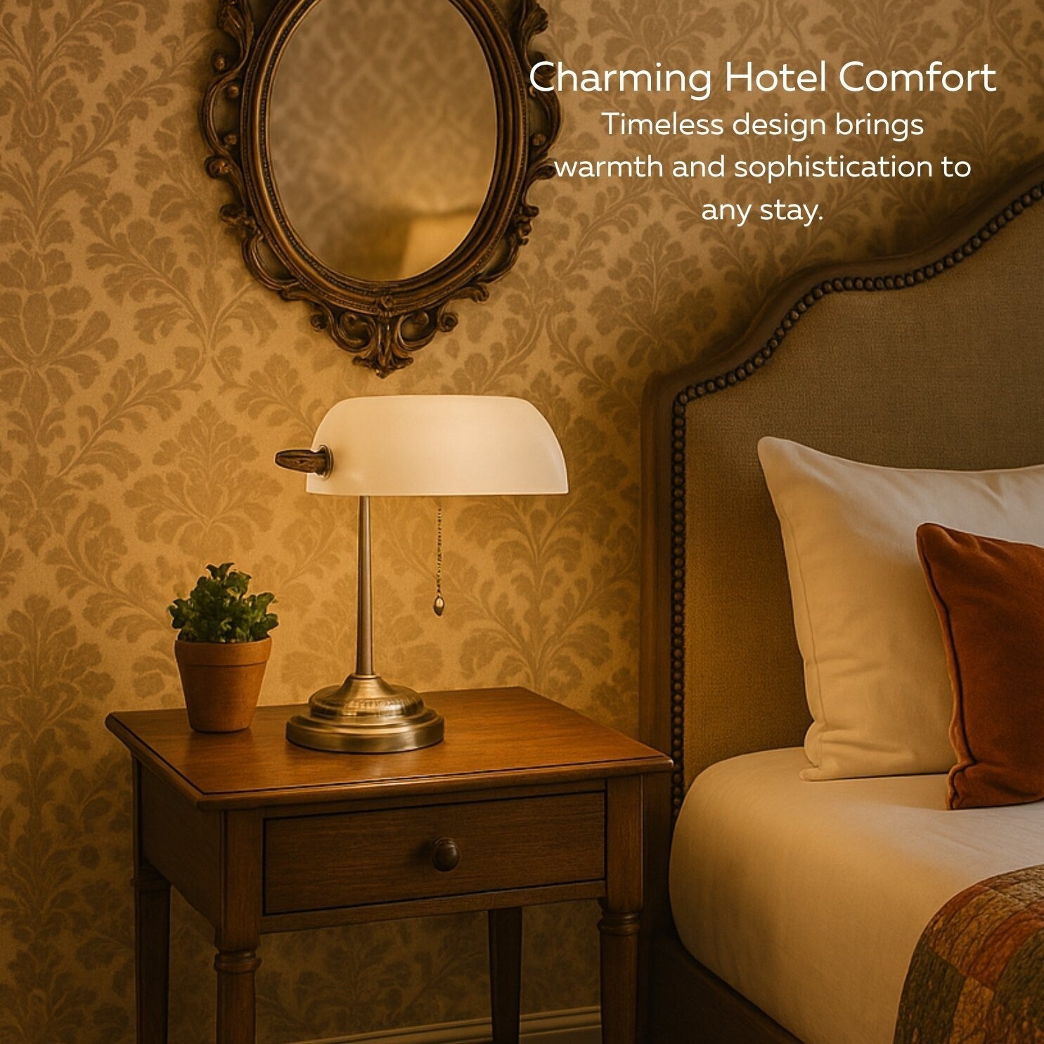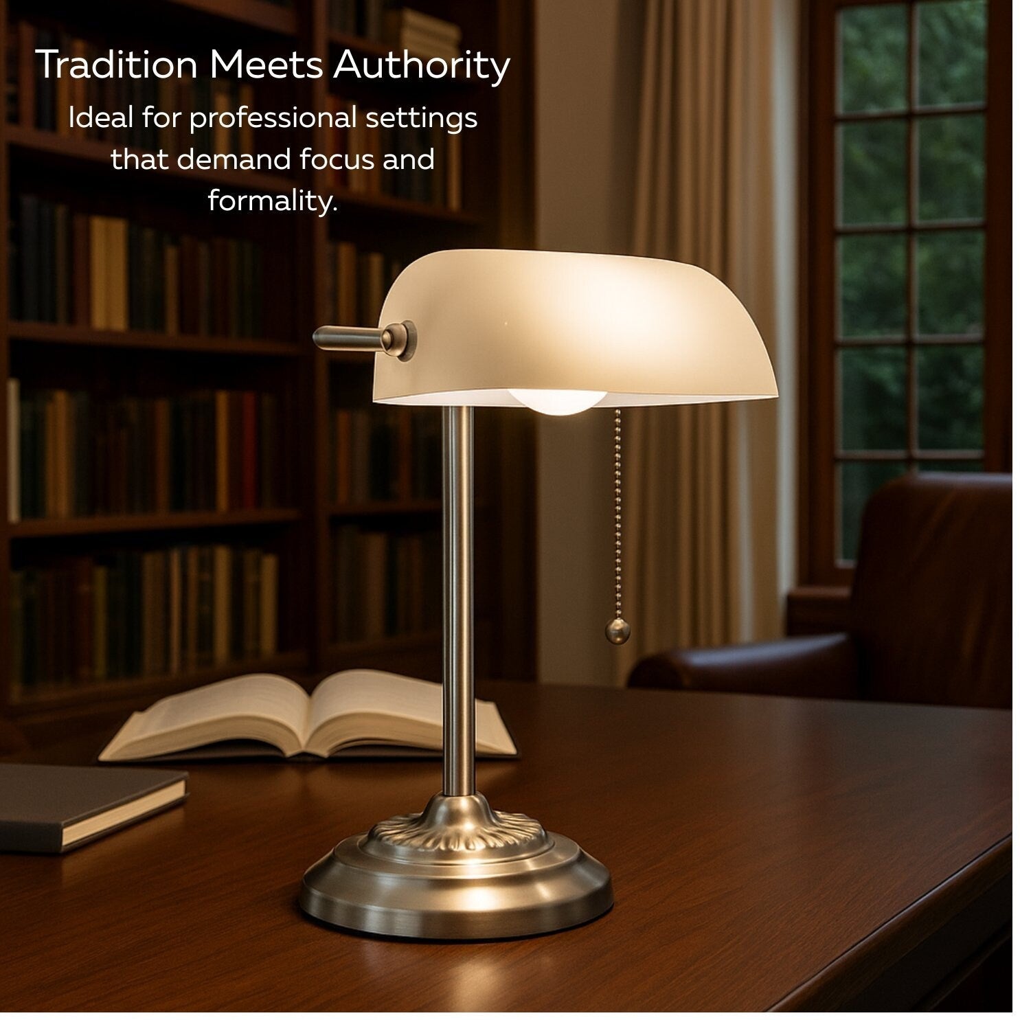 Introduce a touch of traditional sophistication to your workspace with the Bankers Desk Lamp with Green Glass Shade and Brass Finish. This antique-inspired lamp features a durable metal design with a shiny brass finish, a small round base, and a rectangular green glass shade, making it the perfect addition to any home office or professional workspace. The classic pull chain switch allows for easy on-and-off operation, making this desk lamp both fashionable and functional.This lamp is also available in a versatile brushed nickel finish with a neutral white glass shade, providing a great option for any home office decor. It is designed to work with a 40-watt incandescent bulb or the 13-watt CFL equivalent, providing ample lighting for any space. The adjustable shade allows for different lighting directions, making it perfect for positioning in the center of a desk or in the corner of a table. Measuring 15 inches tall and 10.25 inches wide, this desk lamp has a timeless design that instantly adds a touch of traditional style to any interior space.The green color of the lampshade is believed to improve concentration and productivity, making it a great choice for study or work environments. The lamp provides focused, directional lighting that is perfect for reading or writing. The green shade also helps to reduce eye strain and fatigue, making it a comfortable and practical lighting option. The traditional design of the green banker's lamp adds a classic and elegant touch to any space. Green banker's lamps are often adjustable, allowing you to easily direct the light to where you need it.The Bankers Desk Lamp with Green Glass Shade and Brass Finish is the perfect blend of traditional elegance and practical functionality. Add this lamp to your home office or professional workspace todayMetal bankers lamp with a polished brass finish, bankers desk lamp with on/off pull chain this is the perfect gift for an executive desk light or a great lamp for the home office or bedside lampsBankers lamp with green glass shade is detailed with adjustable thick green glass lamp shade this desk lamp features full metal construction with a polished brass finish Looking for desk accessories?Looking for desk lamps for home office this is perfect for use on a desk at home or at work, makes the perfect bankers desk lamp or college desk lampsWhen going back to school consider this a dorm room essentials, use it as. a lamp for bedroom add a led bulb, and turn it into a modern led desk lamp. Or if your looking for lamps for living roomBedside Lamp Measures: 15' H x 10.25' W x 6.4' D its the perfect desk decor or office desk accessories. It is a great reading light table lamp you can even use it as a nightstand lamp.