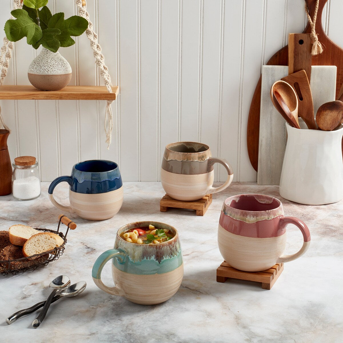 Sip your favorite hot drinks in style with this set of four Tuscon stoneware mugs. Crafted from strong stoneware and finished with a stunning reactive glaze that creates a beautiful spectrum of color on each mug. These oversized mugs are both microwave and dishwasher safe, making them perfect for everyday use. The set includes four unique colors: cobalt blue, fresh green, taupe, and dusty pink.