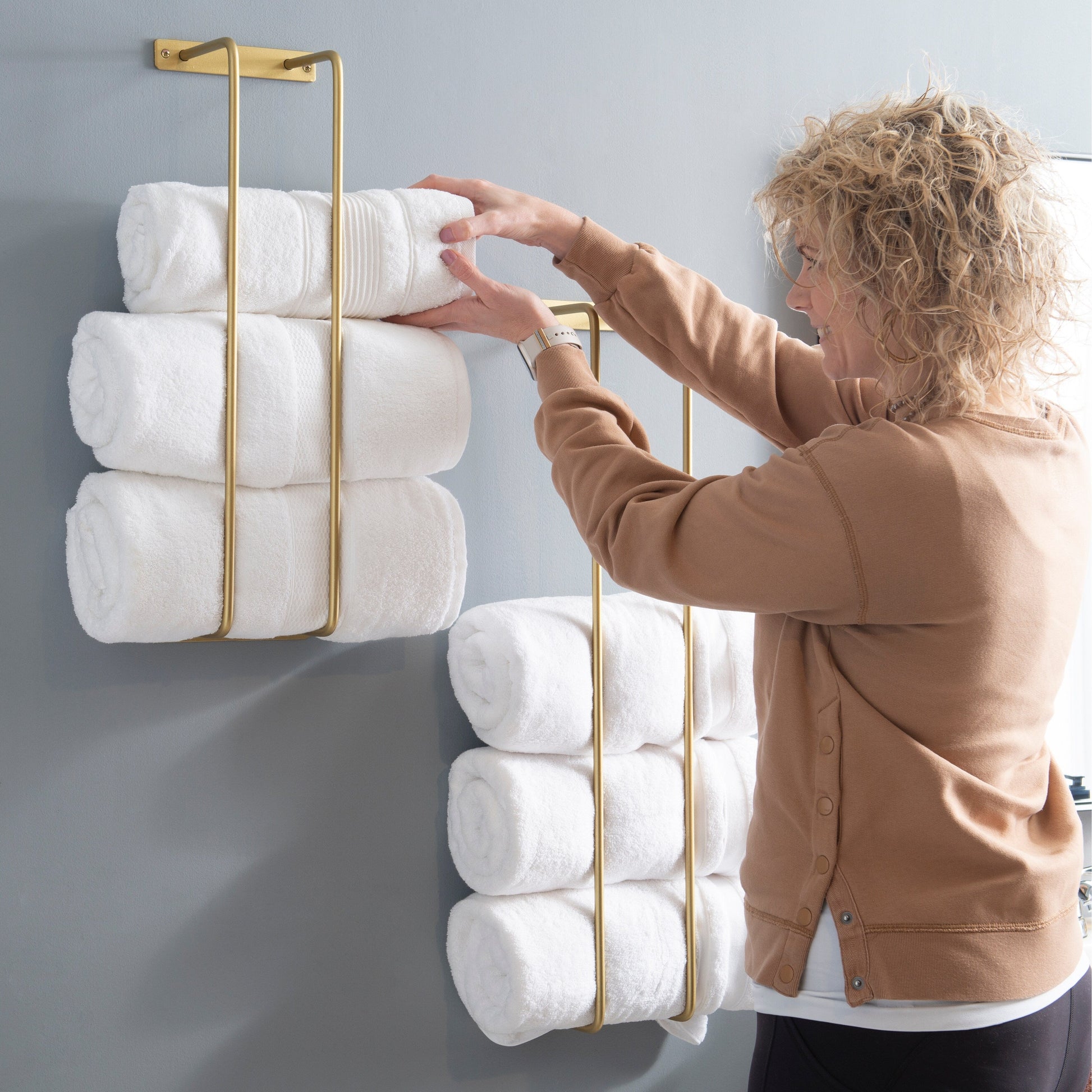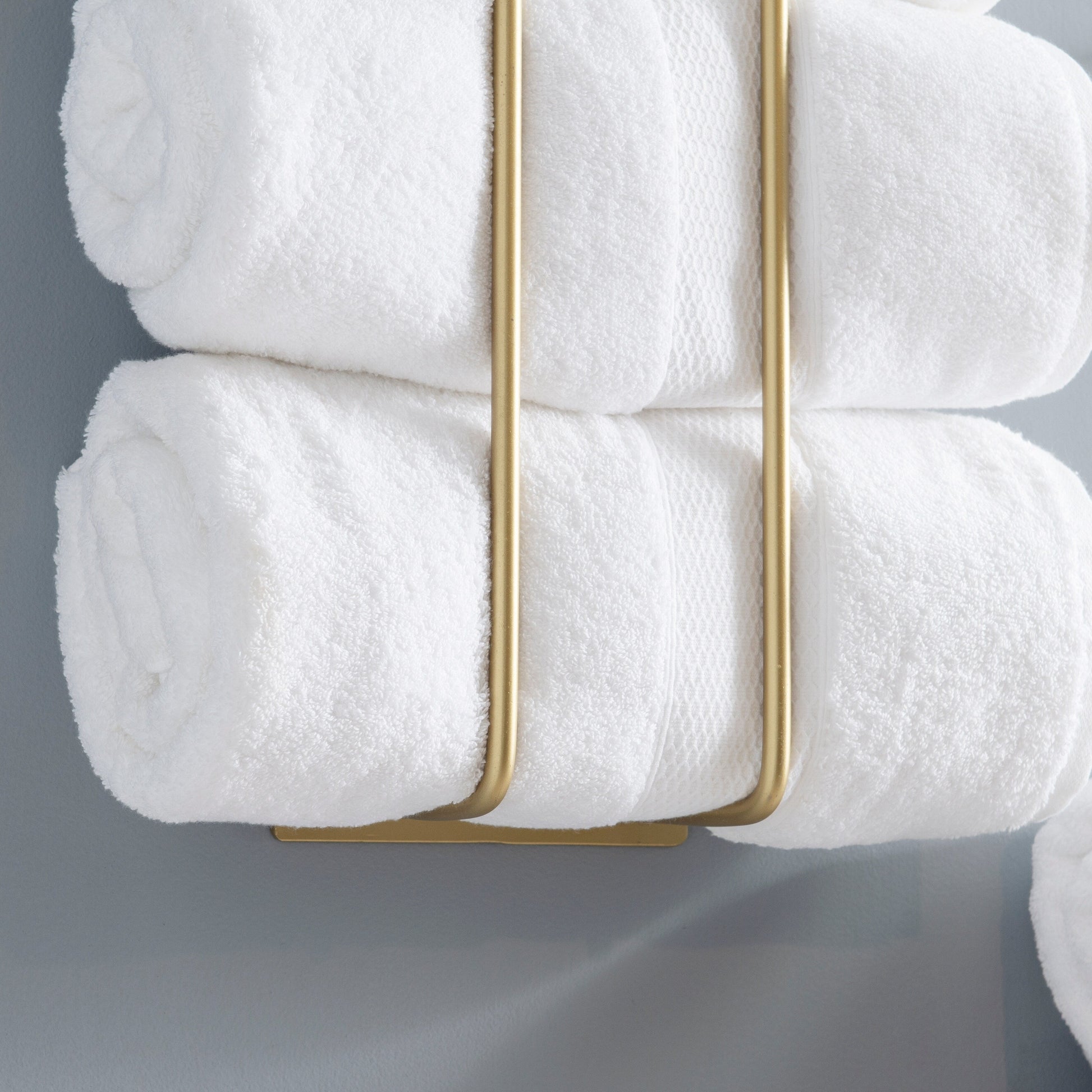 Keep your towels fresh and easily accessible with this unique set of industrial-style towel racks. Perfect in your bathroom, kitchen, or laundry room, made of sturdy 100% iron and painted gold, these racks will fit seamlessly on whichever wall or door you mount it. The open design is made to display large rolled towels, small hand cloths or dishcloths in an organized fashion, allowing you to save space in your cabinets and on countertops. Also great for keeping your yoga mats and towels neat and easy to access.
