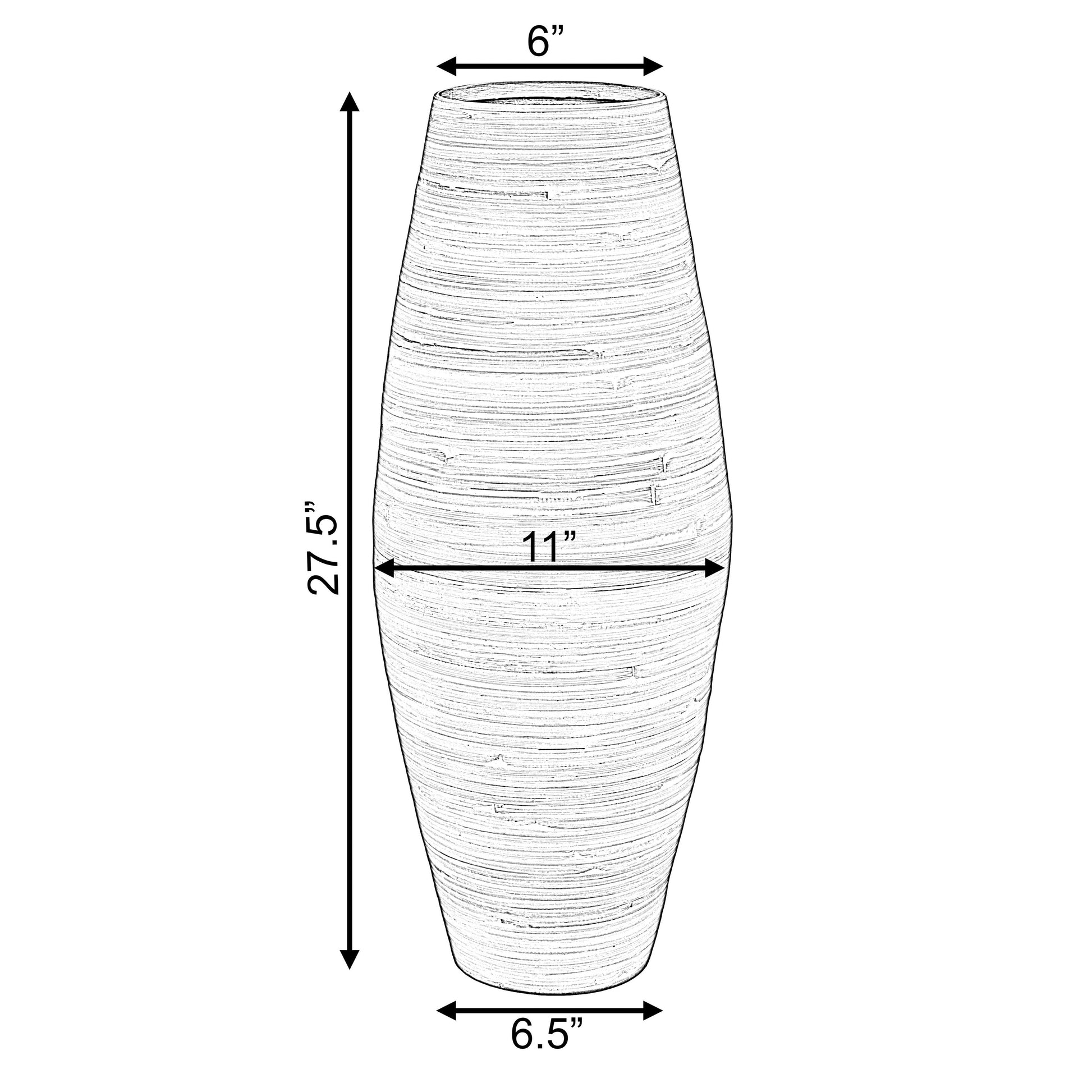 - Dimensions: 28-inch tall, 11-inch diameter at its widest point, and 6-inch opening. Crafted from natural bamboo, this handcrafted vase adds an elegant, earthy accent to living rooms, dining areas, entryways, and hotel lobbies. Its tall, cylindrical shape and bamboo finish enhance modern, rustic, or boho-inspired decor, making it a versatile statement piece for any space.