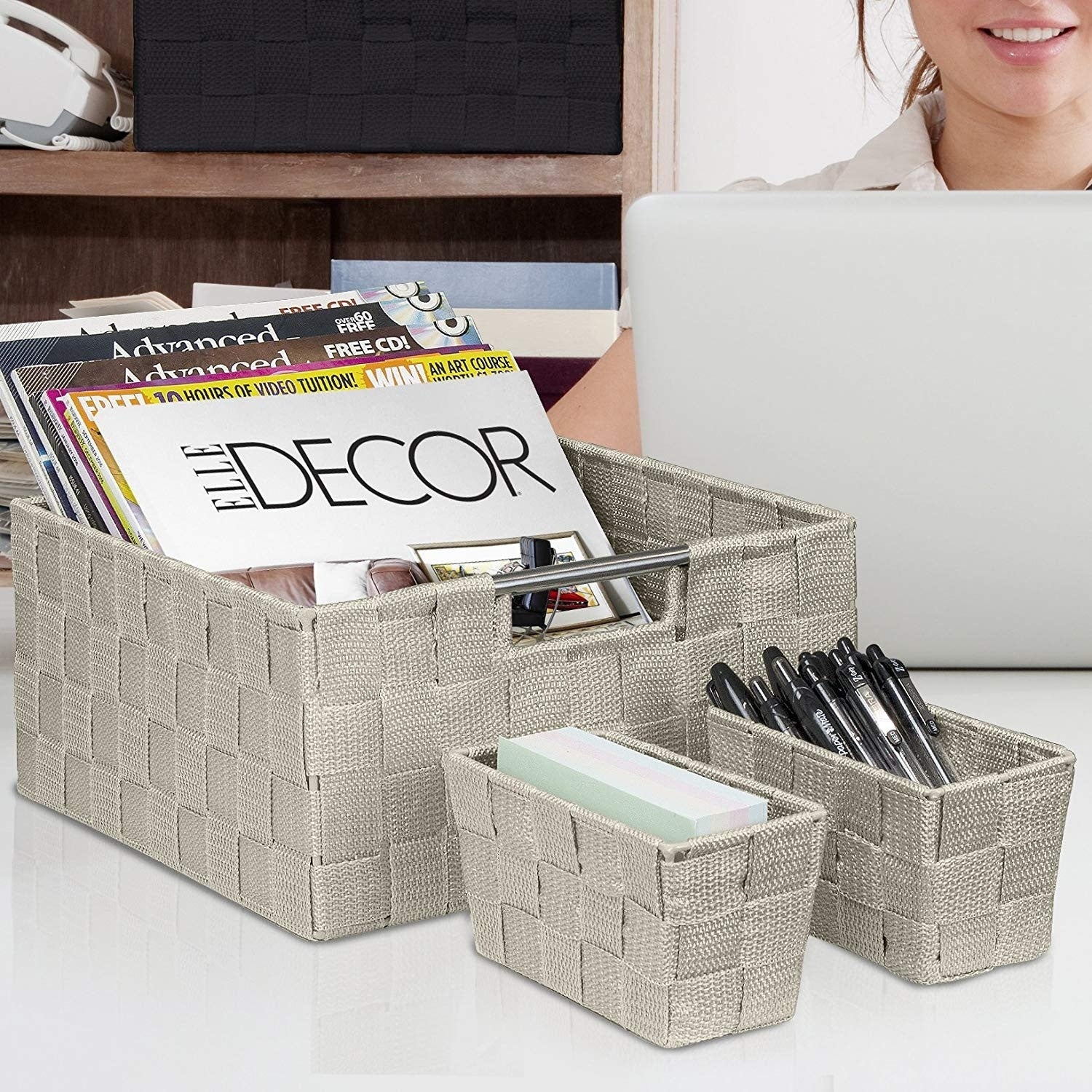 The Sorbus Basket Bin Set offers a decorative way to organize your space. It features 7 baskets of various sizes to store and display your essentials. The larger baskets hold books, magazines, blankets, DVDs, and more, while the smaller baskets hold travel sized products, accessories, office supplies, and small items. For easy transport, use the portable side handles to lift or carry each basket around the home for storage or display. Designed with a classic basket weave pattern, this set makes the perfect accent to your cube organizer, shelf, floor, or tabletop.