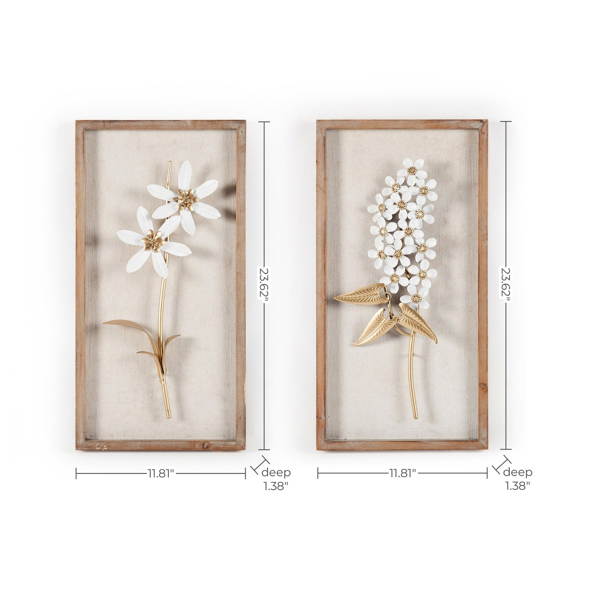 White and Gold Metal Flower Bouquet Wood Frame Wall Decor (Set of 2)