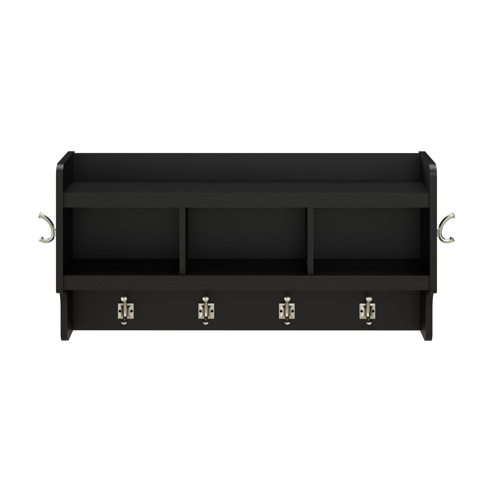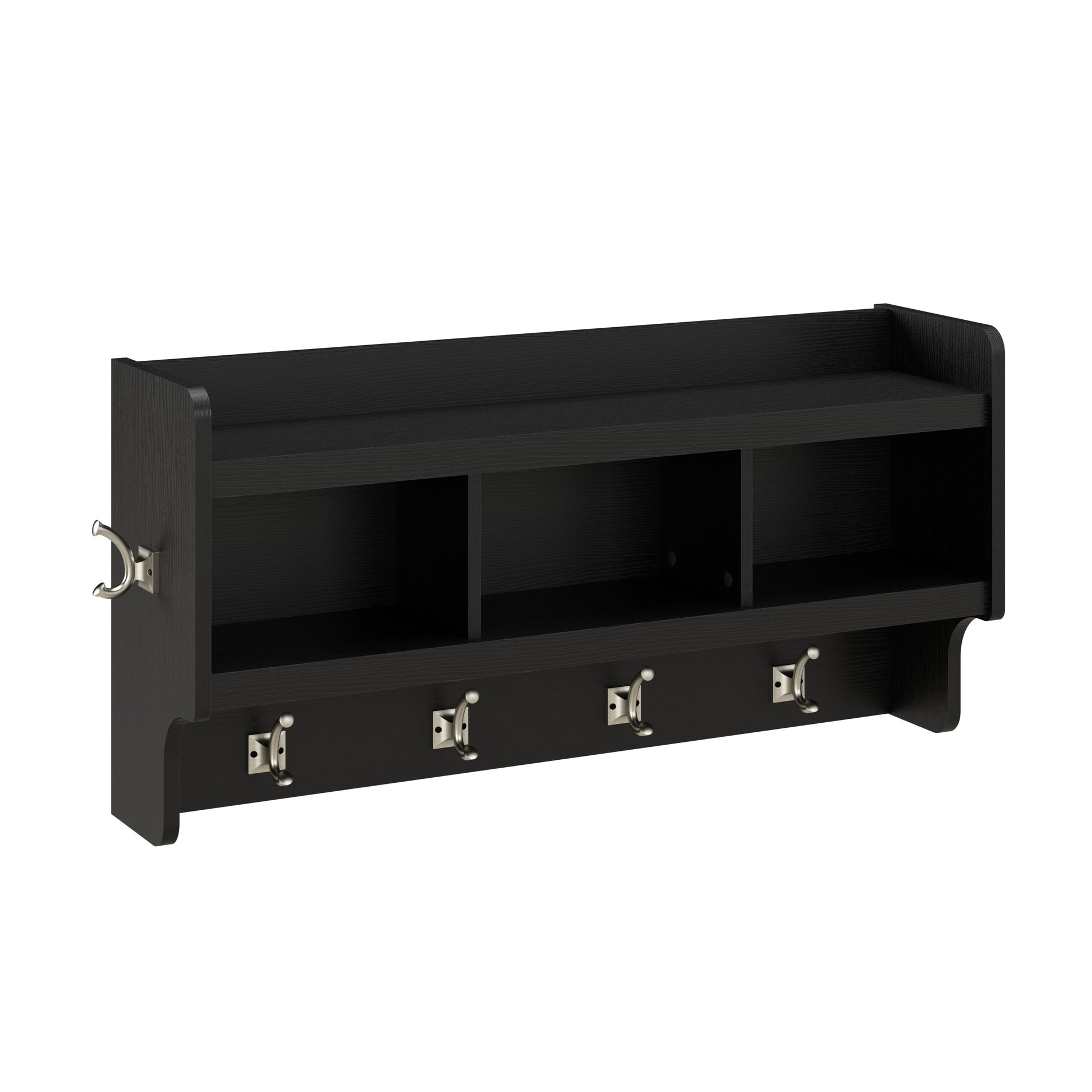 - Wall shelf includes four double-prong coat hooks in the front and one on each side to hang jackets, hats, scarves and more