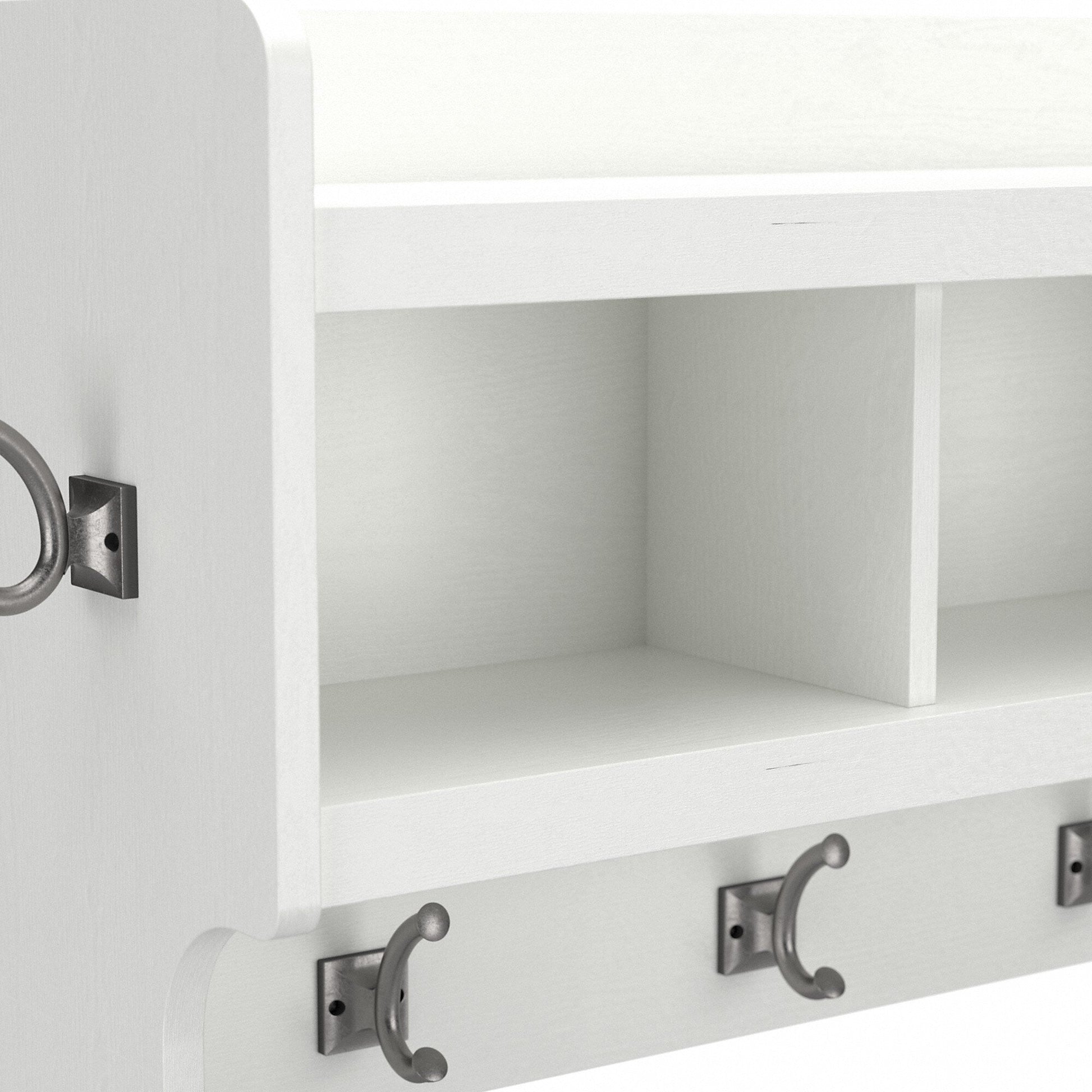 The Bush Furniture Woodland 40W Wall Mounted Coat Rack with Shelf combines transitional styling and a practical design to offer an ideal entryway organizer. Store outerwear and other daily essentials in one convenient location so that everything is right where you need it when it's time to head out the door again. The wall shelf includes four Weathered Nickel coat hooks in the front and one on each side for hanging jackets, hats, scarves and more. Smaller items like gloves and keys can be stashed neatly inside three open cubby spaces while the top shelf provides an area to brighten up your entryway with decorations. Coat hooks support up to 15 pounds, and the total weight capacity of the wall mounted shelf is 25 pounds. The wall coat rack's transitional design blends elements of contemporary and traditional styling to complement a wide range of home furnishings while your choice of several attractive finish options make it easy to find the perfect look for your space. This entryway wall organizer has been rigorously tested to meet Bush Furniture's standards for safety, performance and durability and is backed by a 3 Year Manufacturer's Warranty. See the full Woodland Collection to complete your home's entryway, mudroom or foyer with style.