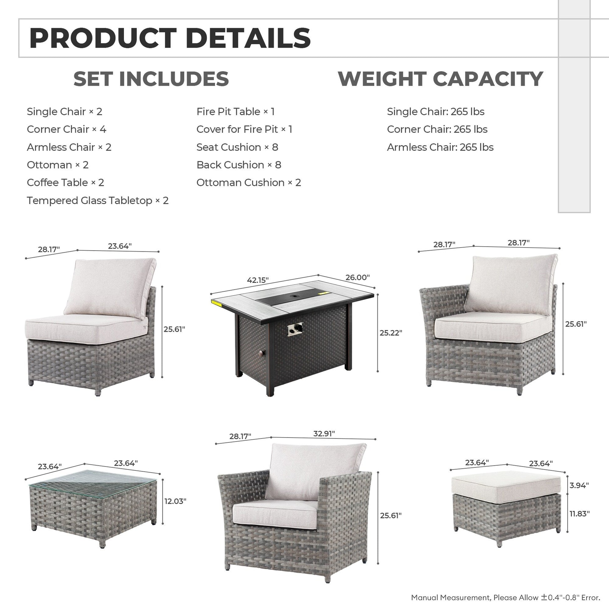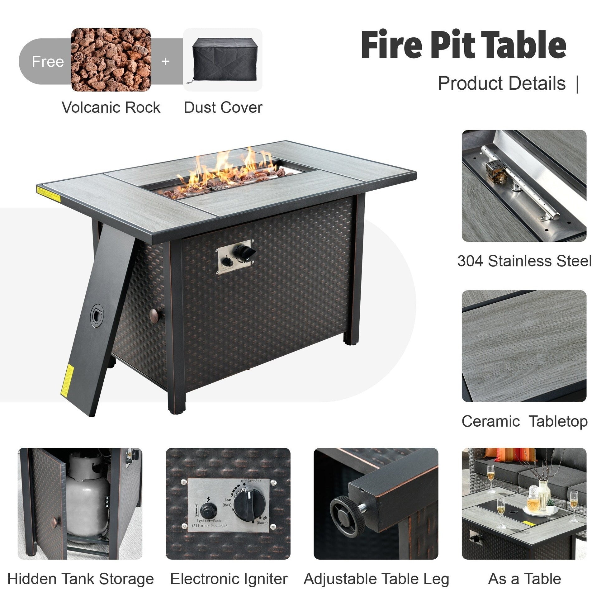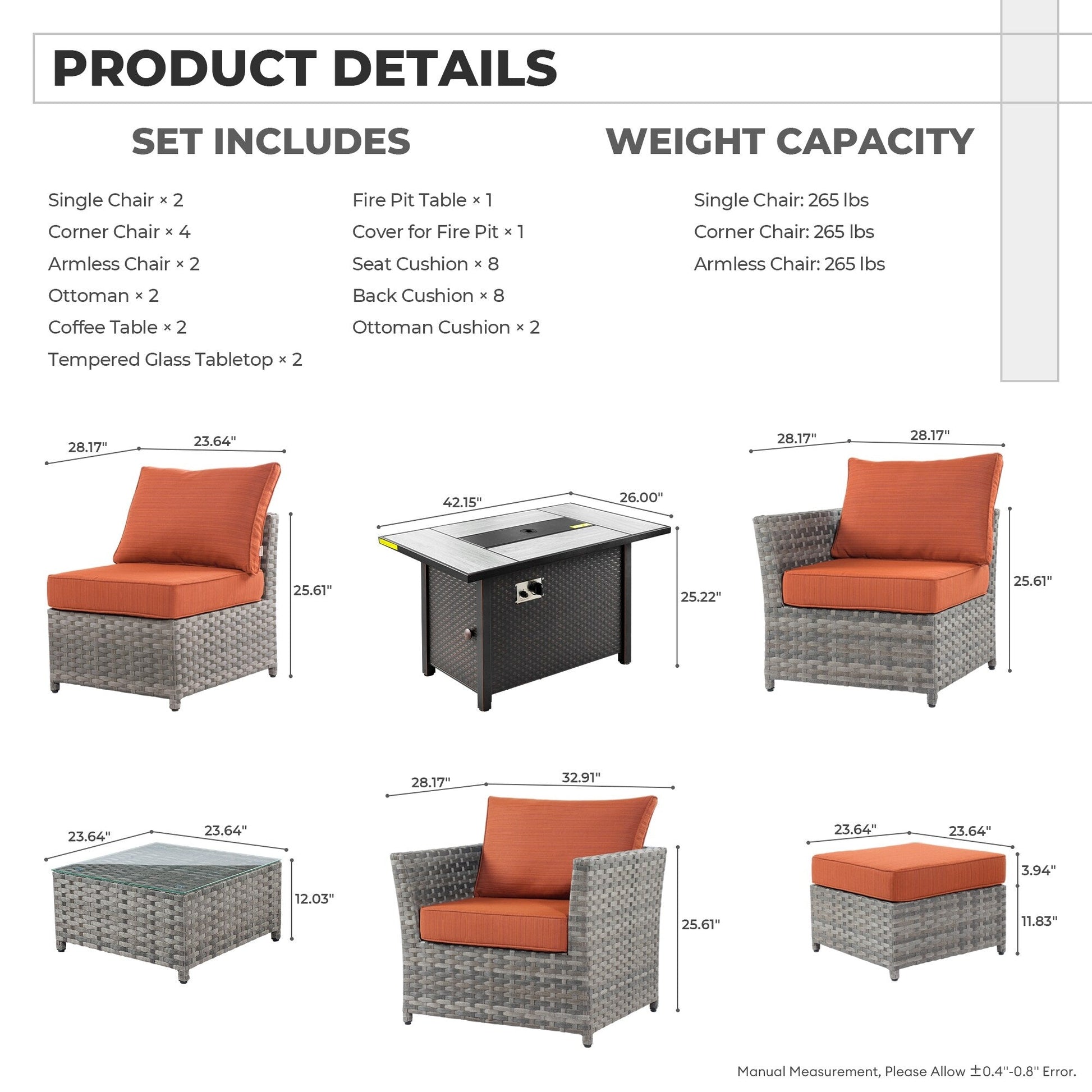 Patio outdoor 13-piece furniture set is crafted from high-quality PE wicker, powder coated rust-resistant steel frame, sturdy and durable. Modern and simple design suitable for any decoration style and they can be freely rearranged into the different combinations as you want to suit any space. The 42-inch fire pit table is well matched with the furniture set and you can enjoy the warm and cozy time with your family and friends on the patio, garden, porch, backyard, balcony and deck.