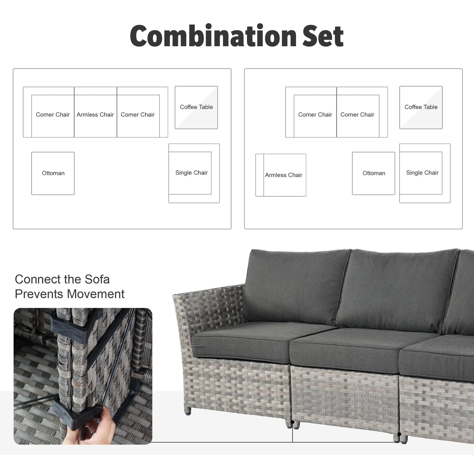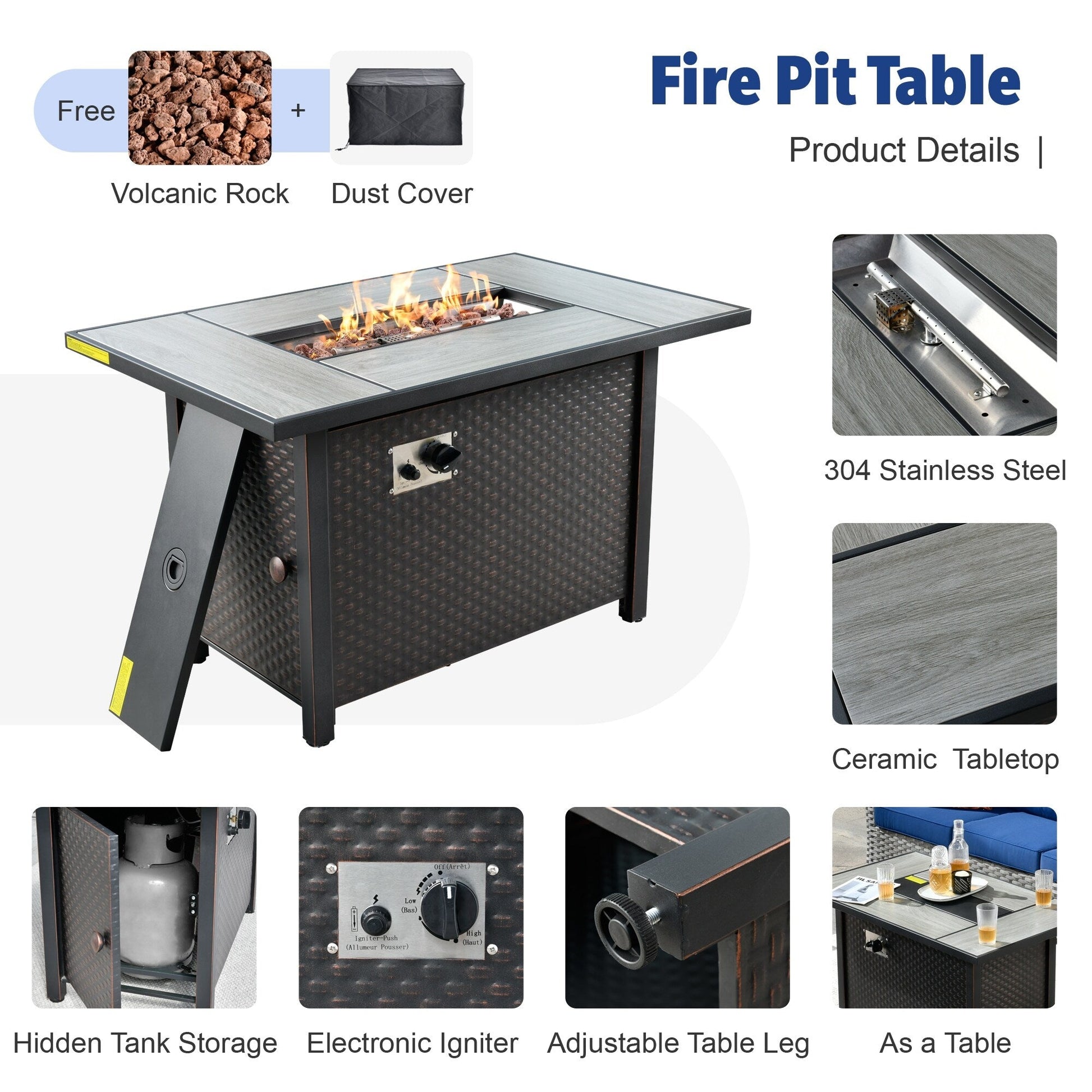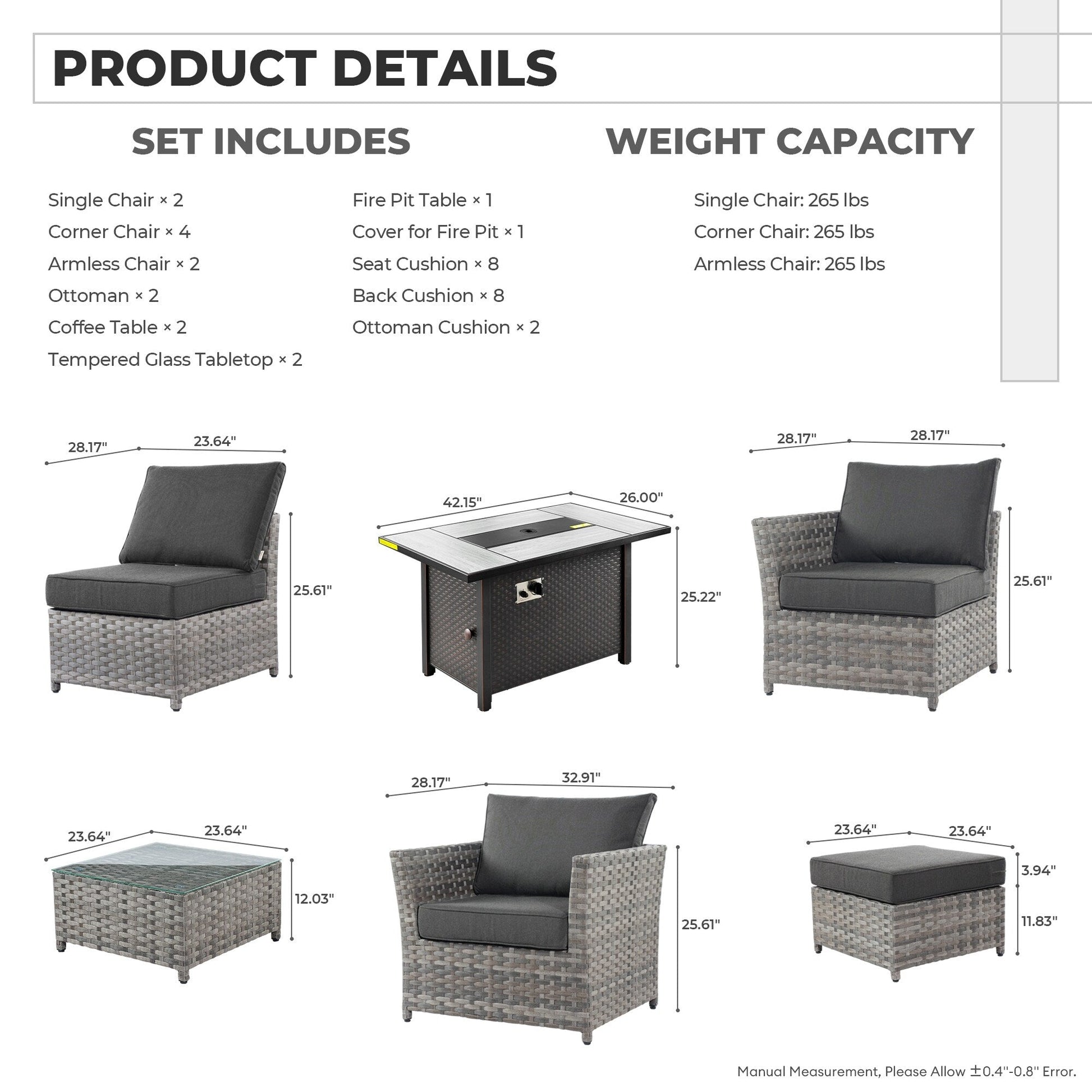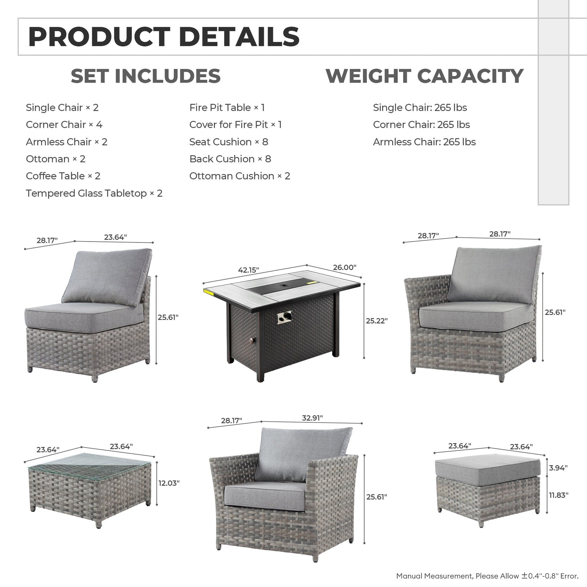 Patio outdoor 13-piece furniture set is crafted from high-quality PE wicker, powder coated rust-resistant steel frame, sturdy and durable. Modern and simple design suitable for any decoration style and they can be freely rearranged into the different combinations as you want to suit any space. The 42-inch fire pit table is well matched with the furniture set and you can enjoy the warm and cozy time with your family and friends on the patio, garden, porch, backyard, balcony and deck.