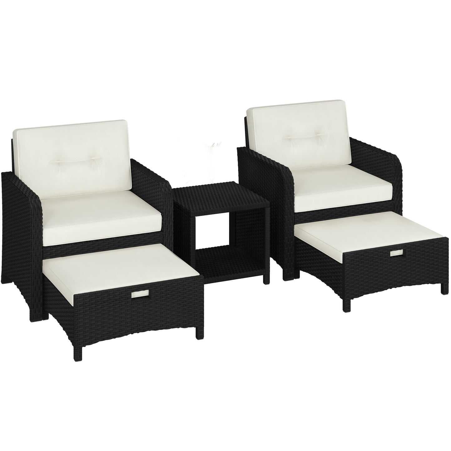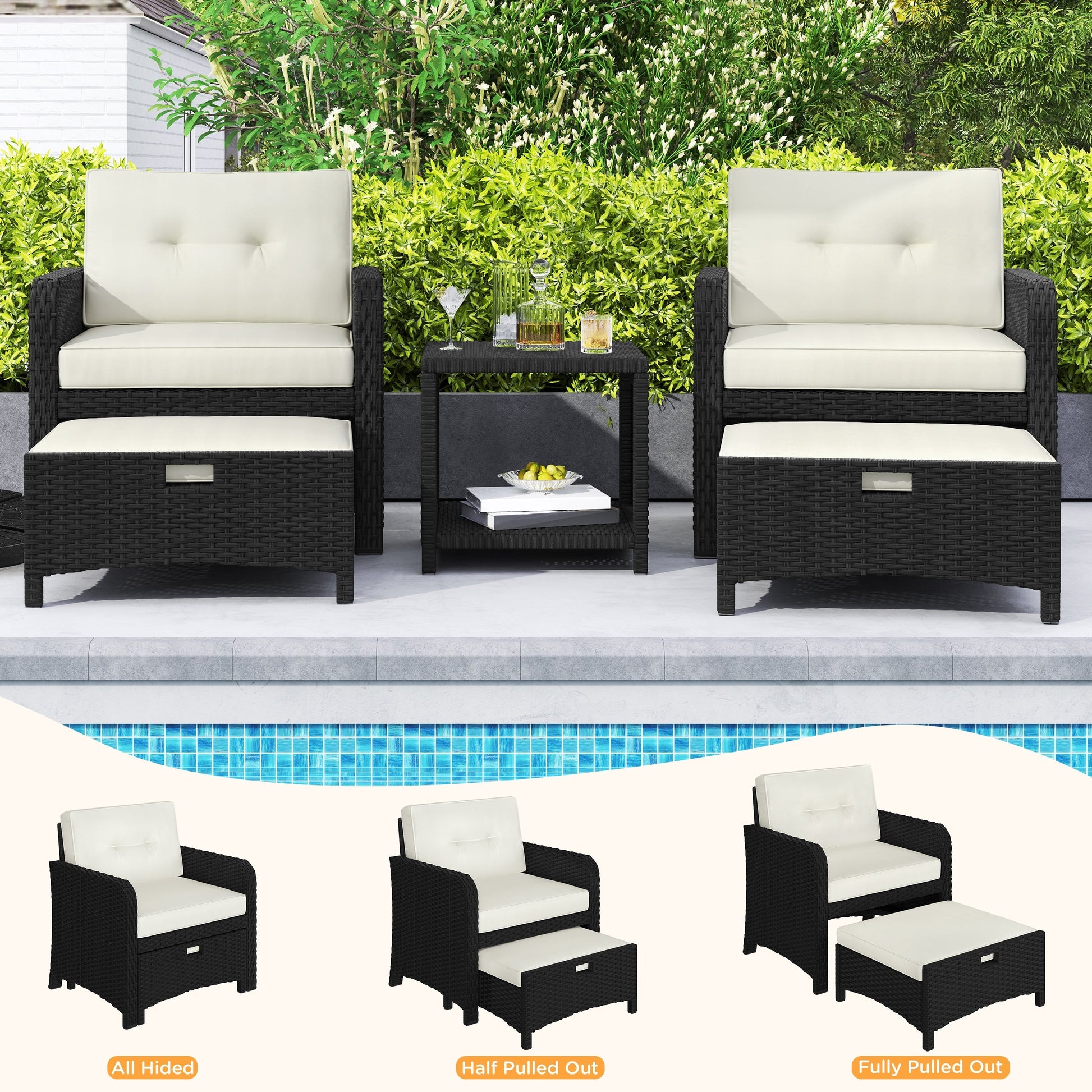 - Five-piece Rattan Set: ?This furniture set includes a side table, two chairs, two ottomans, and ?thick pillows and cushions, offering you and your guests a comfortable ?space to relax and enjoy outdoor conversations