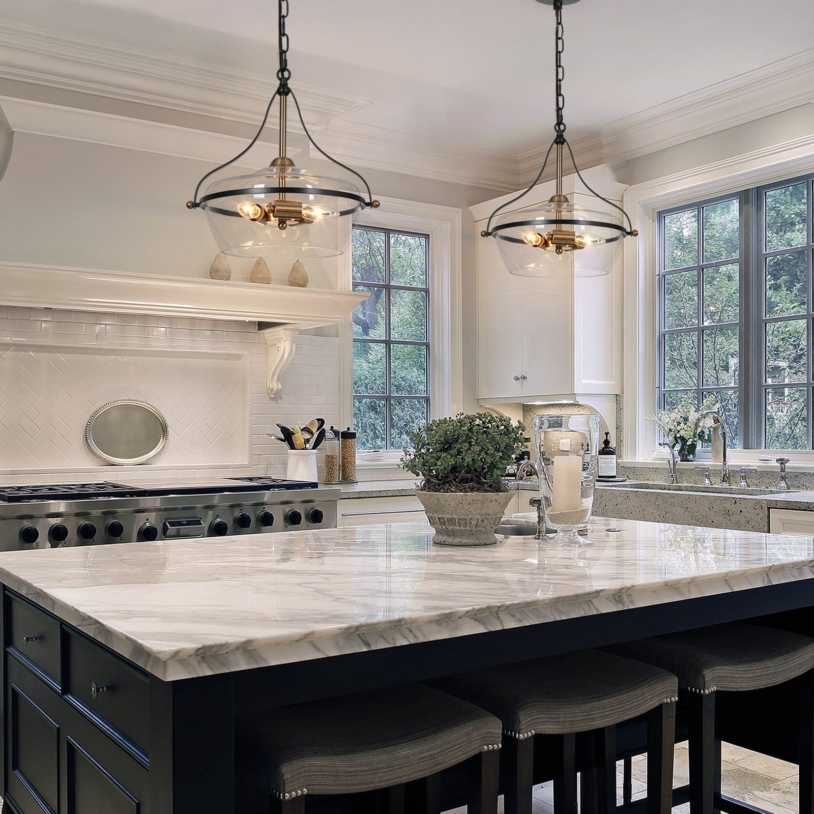 Zelena Modern Farmhouse Black Gold Chandelier 3-Light Glass Pendant Light for Kitchen Island Dining Room
